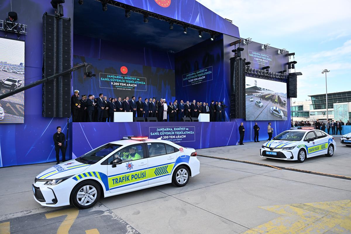 Başkan Erdoğan, böylece hem görev araçlarının niteliğini hem de vatandaşlara sunulan hizmetlerin etkinliğini arttırdıklarını belirterek, “Geçen sene yine burada yaptığımız törenle jandarma ve emniyet teşkilatlarımıza 7 bin 204 yeni aracı kazandırmıştık. Bugün de 9 bin 200 aracı daha resmen sizlerin hizmetine veriyoruz. Bu araçlardan 7 bin 80 tanesi emniyetimiz, 2 bin 70 tanesi jandarmamız, 50 tanesi ise sahil güvenliğimiz tarafından kullanılacak. Hayırlı uğurlu olsun diyorum.” diye konuştu.