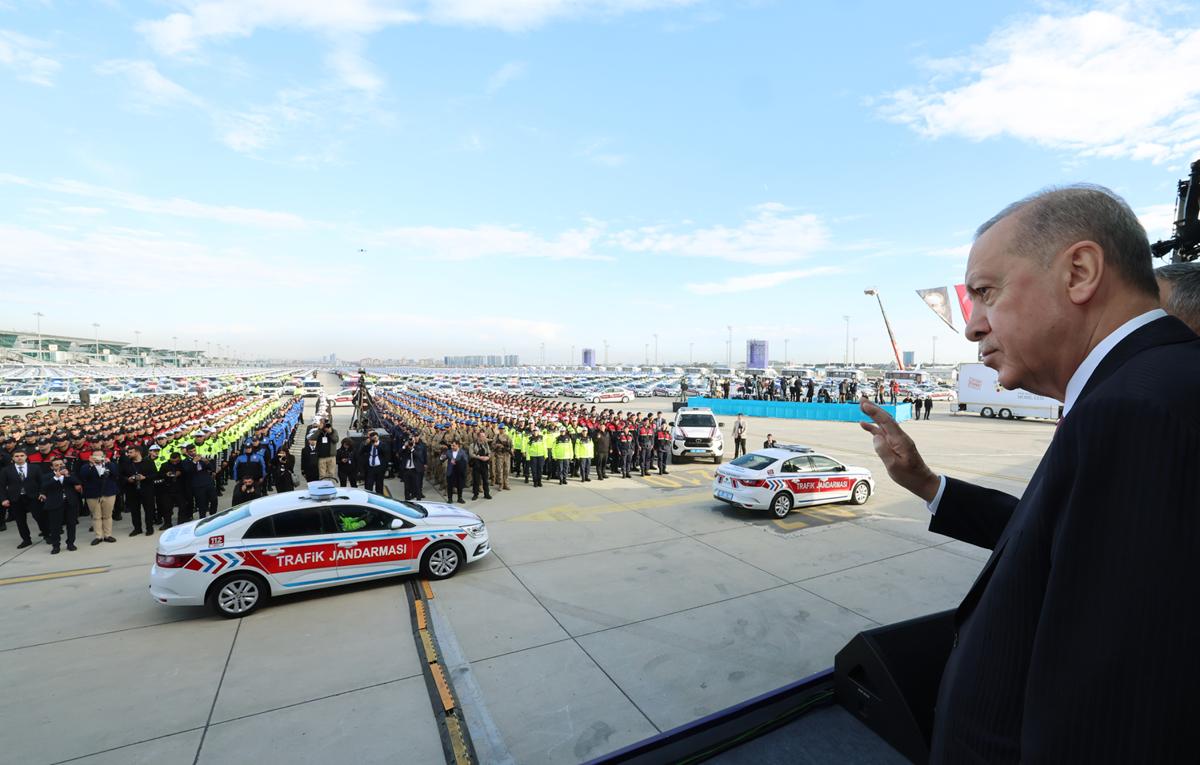 Başkan Erdoğan, Atatürk Havalimanı’nda düzenlenen Jandarma, Emniyet ve Sahil Güvenlik Teşkilatı için 9 bin 200 yeni aracın hizmete alım törenindeki konuşmasında, alandaki katılımcıları selamlayarak İstanbul’la birlikte 81 ildeki güvenlik güçlerini selamladı.