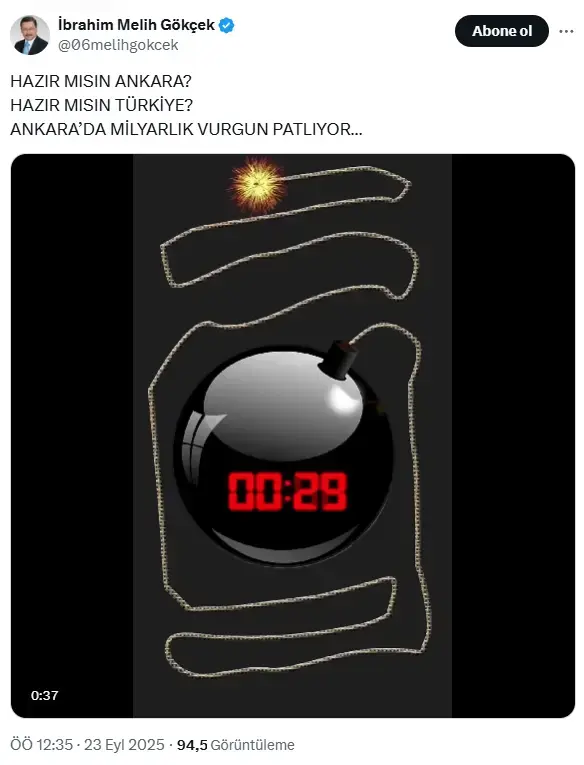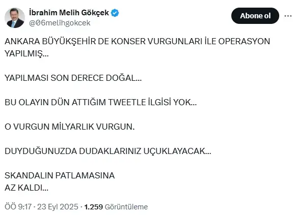 Gökçek’in ABB’ye yönelik operasyondan saatler önce X hesabından yaptığı paylaşımda “Hazır mısın Ankara? Hazır mısın Türkiye? Ankara’da milyarlık vurgun patlıyor” ifadelerini kullandığı görüldü.